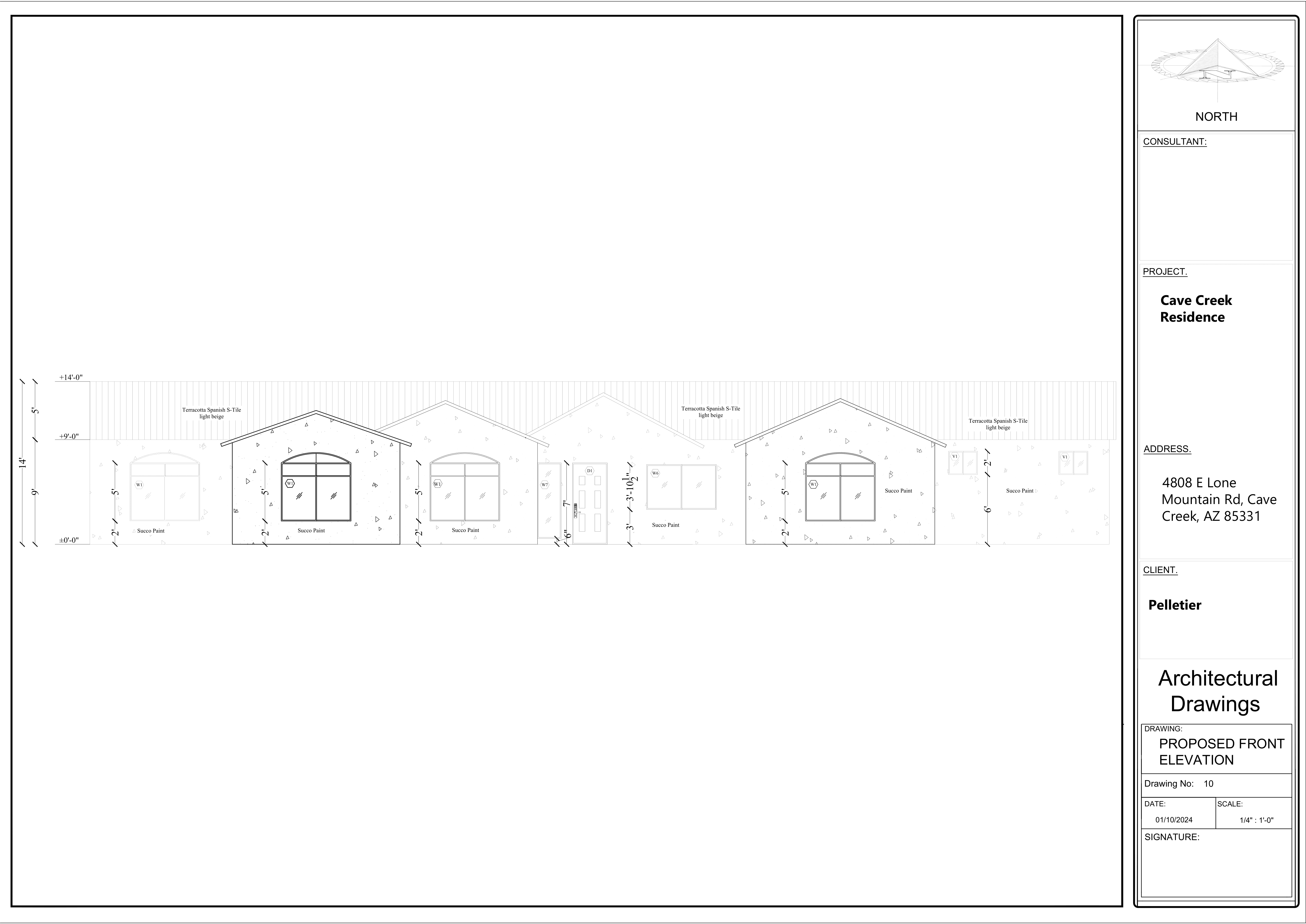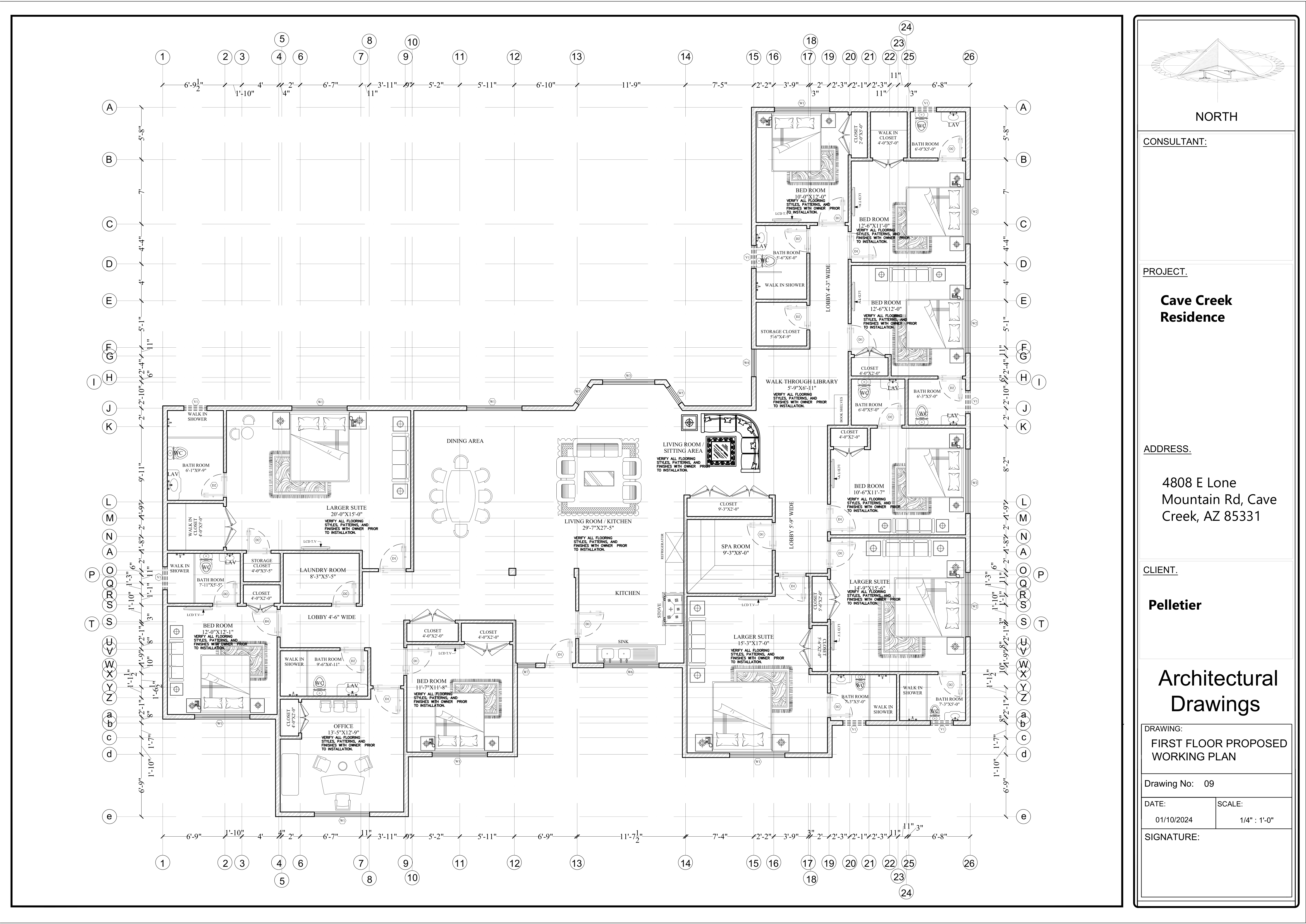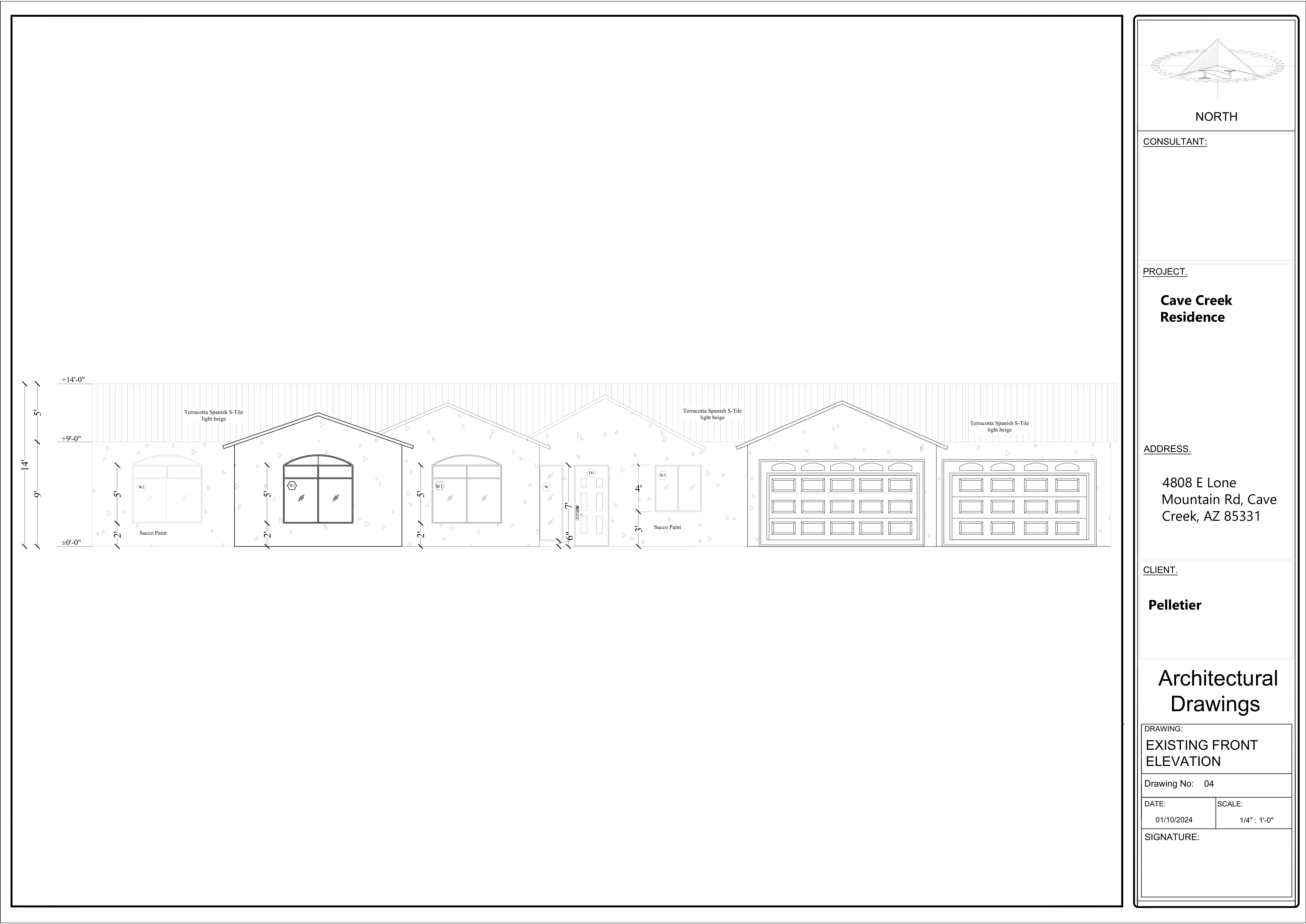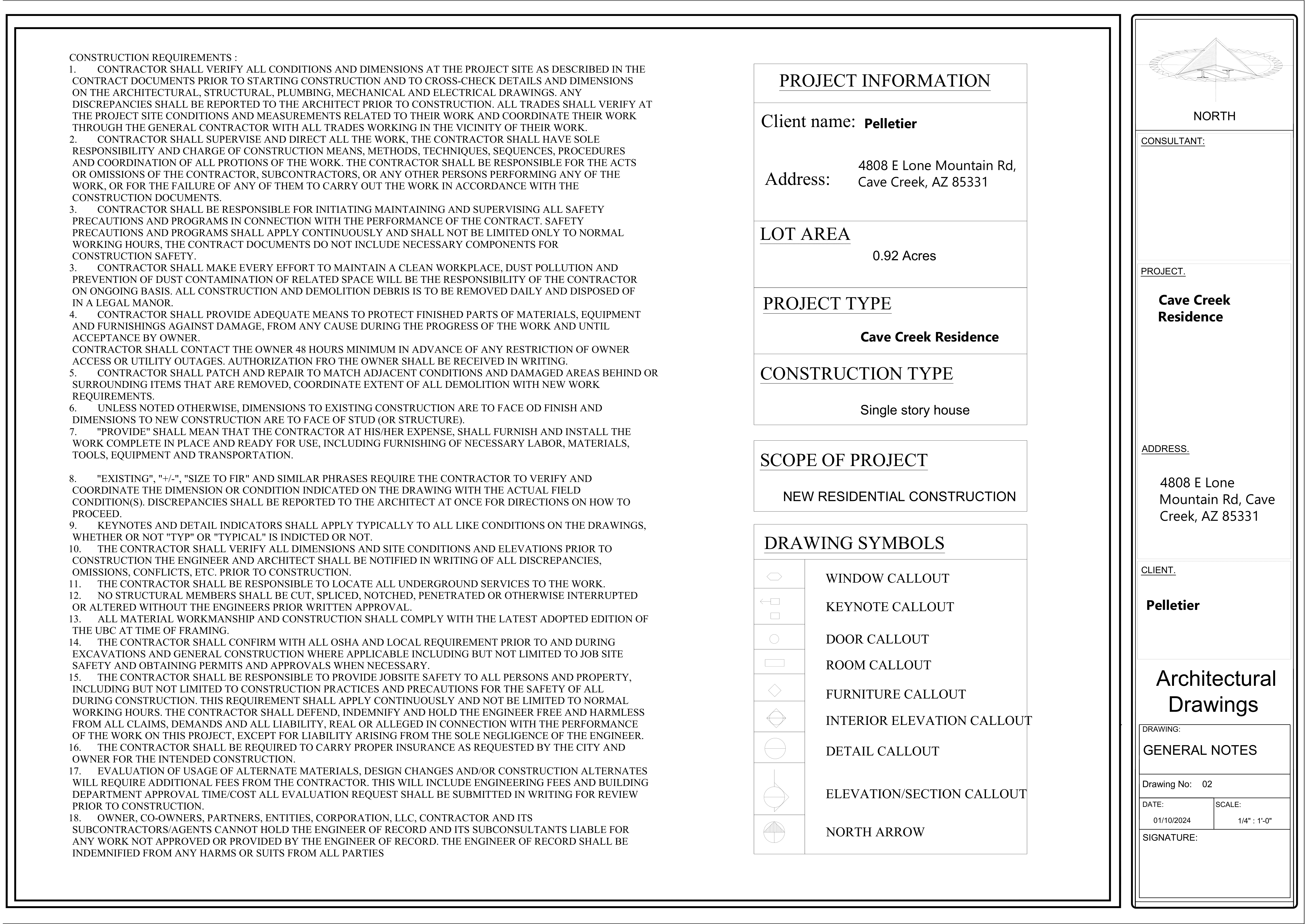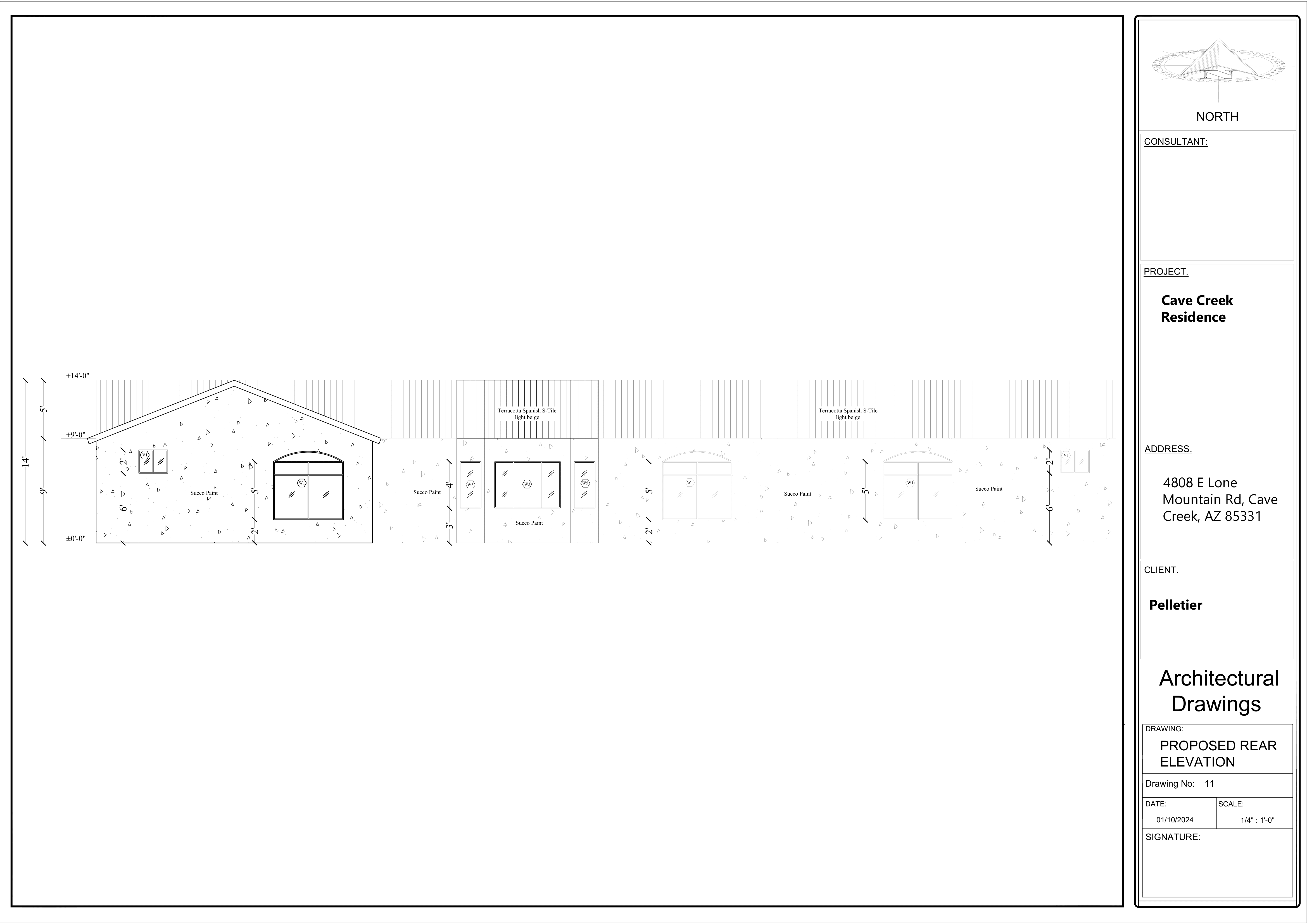 This project was developed for the Pelletier family in Cave Creek, focusing on detailed architectural drawings for a residential home. The design emphasizes harmony with the natural desert landscape while offering modern comforts and spacious living. Every detail—from layout to structural articulation—was thoughtfully planned to ensure both functionality and elegance, creating a refined living experience in this serene location.